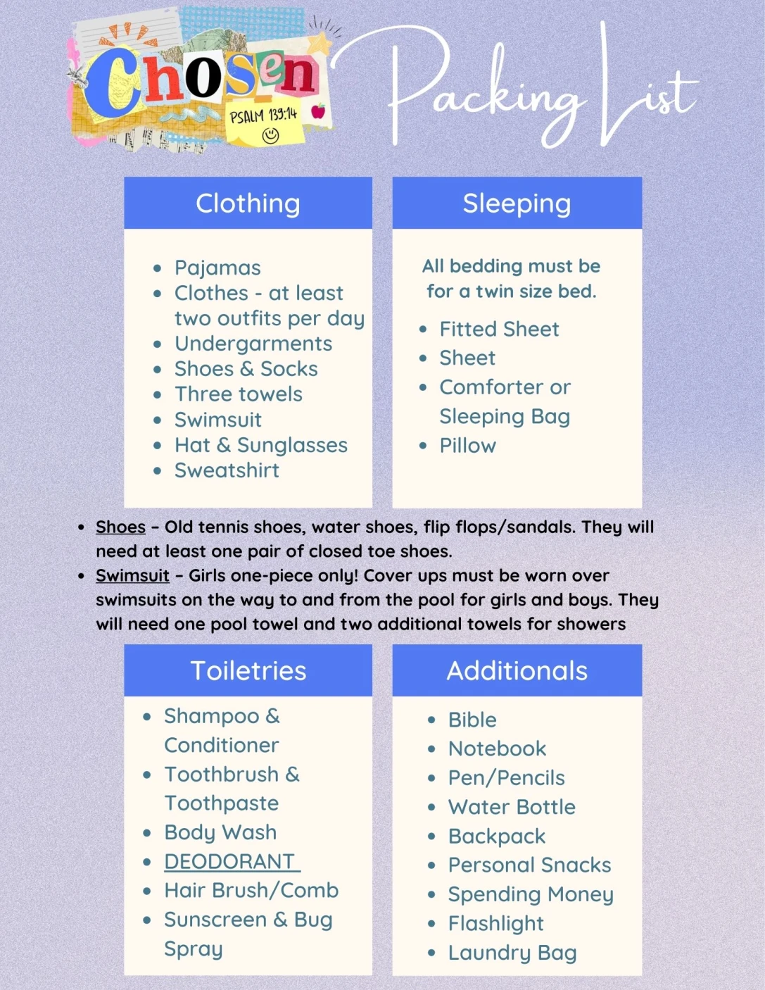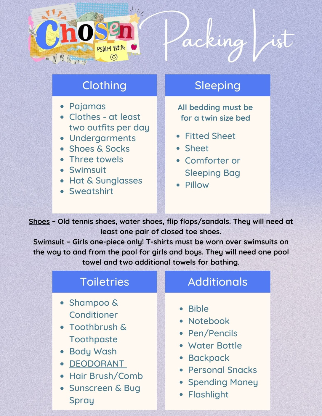 Kids Camp is a 5-day camp experience for kids that are currently in grades 3-5. This year our Kid’s Camp THEME IS CHOSEN.